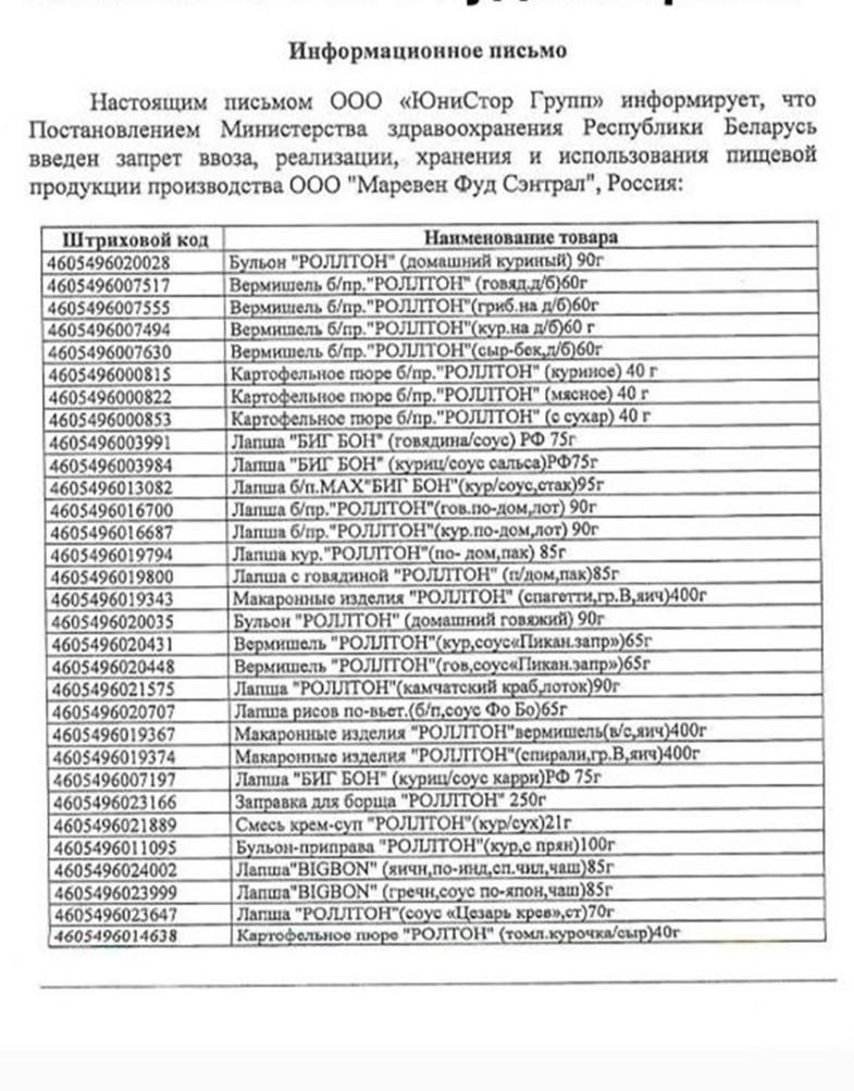 Нарушение стало основанием запрета ввоза на территорию Беларуси и обращения всего ассортимента продукции ООО «Маревен Фуд Сэнтрал», включая торговые марки «Петра», «Роллтон» и др.