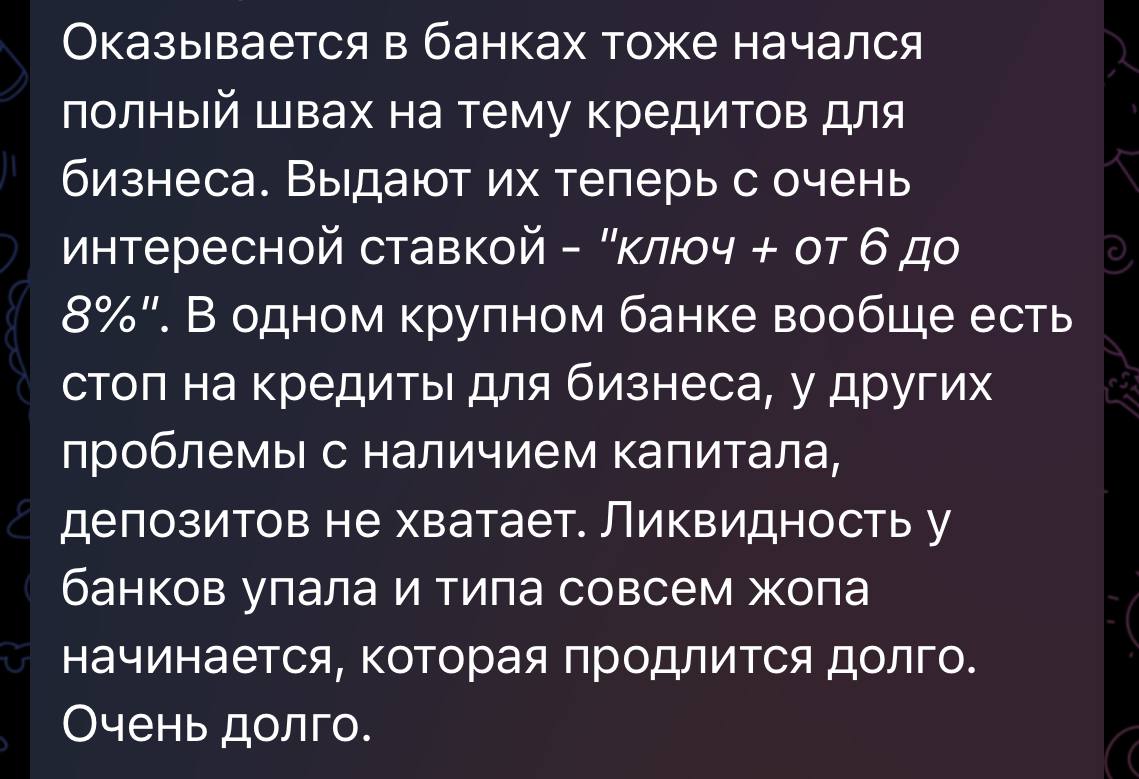 🤓 Коллеги сообщают, что банковские кредиты для бизнеса — все. А именно: ключевая плюс 4-6%, что технически неподъемно, если ты занимаешься относительно законным бизнесом.