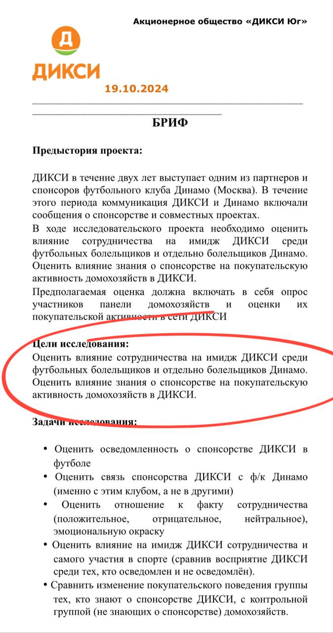 🤓 Дикси тендерит и исследование, цель которого можно сформулировать по-простому: «помогите нам посчитать отдачу в деньгах от имиджевых затрат на футбольное спонсорство, финансисты очень настаивают».