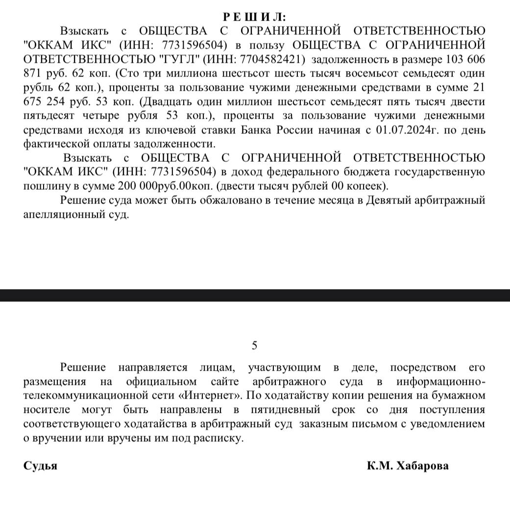 🤓Решение суда по иску конкурсного управляющего Гугля к Оккаму — «иск удовлетворить полностью».