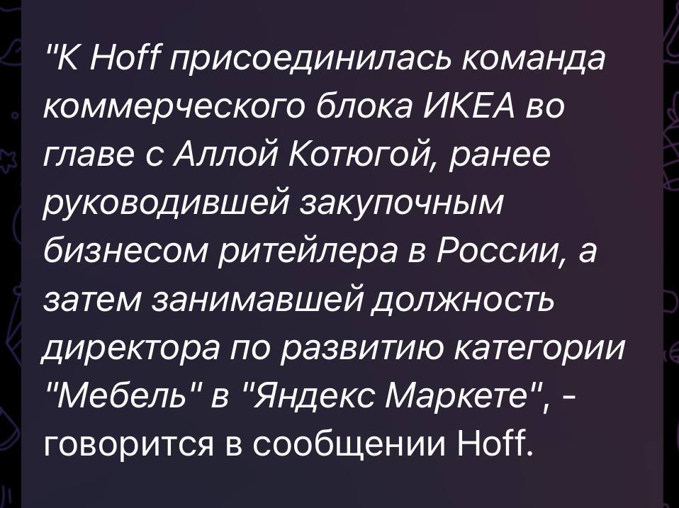 🤓Оказывается, часть команды ИКЕА уже успела поработать в Яндекс Маркете и свалить оттуда в ХОФФ. Уверены, экспертиза выходцев из шведского гиганта — нарасхват, но как они смогут адаптироваться в чужеродной, местами противоестественной, среде российского бизнеса? Неизвестно.