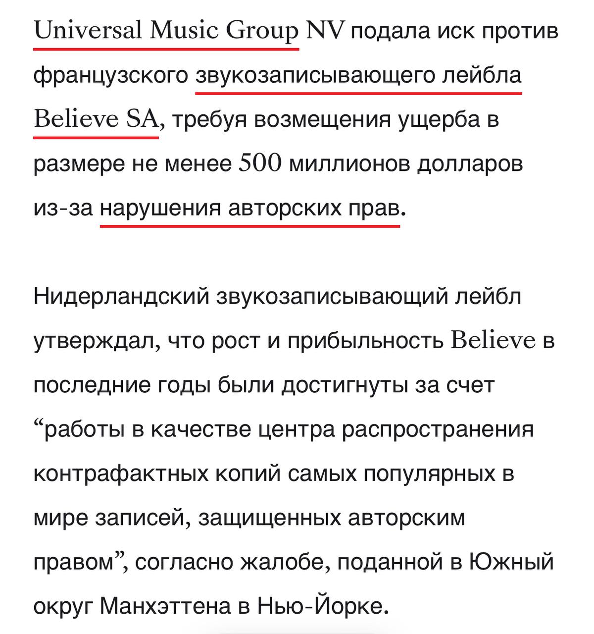 Юниверсал хочет получить подряда от платформы Believe, которая помогает независимым музыкантам и небольшим лейблам распространять и продавать свои работы в системах потокового вещания.