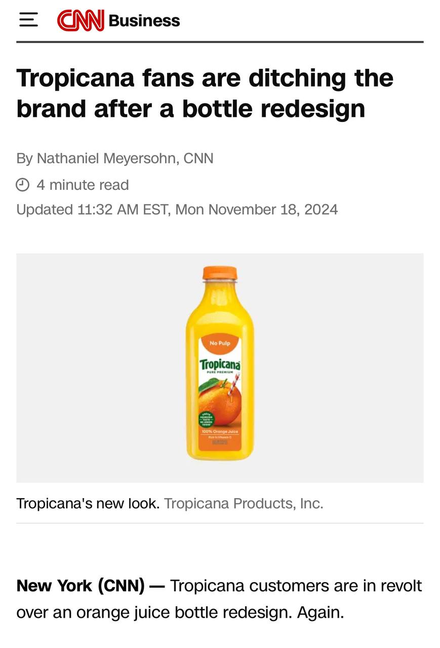 Π ΠΈΡΠ»Π΅ ΠΏΡΠΎΠ΄Π°ΠΆΠΈ Tropicana ΡΠΏΠ°Π»ΠΈ Π½Π° 8,3% ΠΏΠΎ ΡΡΠ°Π²Π½Π΅Π½ΠΈΡ Ρ ΠΏΡΠ΅Π΄ΡΠ΄ΡΡΠΈΠΌ Π³ΠΎΠ΄ΠΎΠΌ, ΡΠΎΠ³Π»Π°ΡΠ½ΠΎ Π΄Π°Π½Π½ΡΠΌ ΠΎ ΠΏΡΠΎΠ΄Π°ΠΆΠ°Ρ ΠΈΡΡΠ»Π΅Π΄ΠΎΠ²Π°ΡΠ΅Π»ΡΡΠΊΠΎΠΉ ΡΠΈΡΠΌΡ Circana, ΠΊΠΎΡΠΎΡΡΠΌΠΈ ΠΏΠΎΠ΄Π΅Π»ΠΈΠ»Π°ΡΡ Ρ CNN. Π Π°Π²Π³ΡΡΡΠ΅ ΠΏΡΠΎΠ΄Π°ΠΆΠΈ ΡΠΏΠ°Π»ΠΈ Π΅ΡΠ΅ Π½Π° 10,9%.