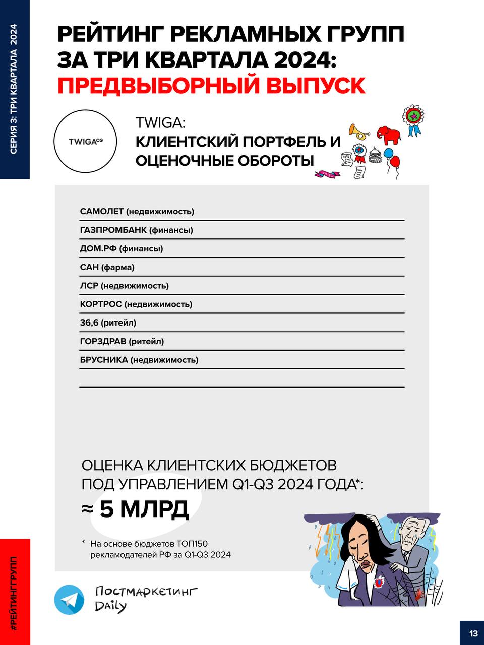 🤓 Продолжаем публикацию Рейтинга оборотов рекламных групп и агентств за 1-3 квартал 2024 года, который мы прервали из-за насыщенного НРФа. Сегодня — Игроник, Twiga и SA Media.