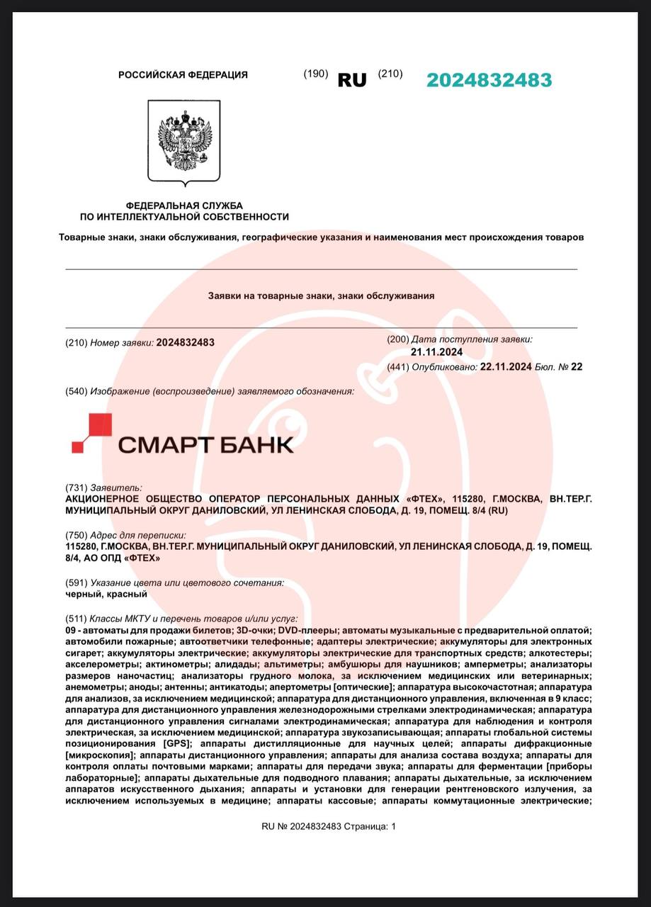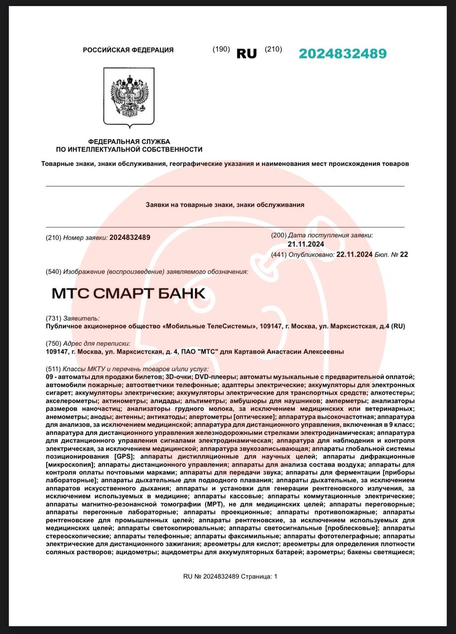 🤔 Очень странное совпадение. В один и тот же день два несвязанных юрлица подали заявку на товарный знак «Смарт Банк». Один из заявителей — МТС.