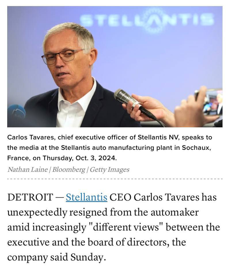 🤓 Генеральный директор одного из крупнейших в мире автопроизводителей Stellantis Карлос Таварес уволился на фоне проблем в США и падения продаж.