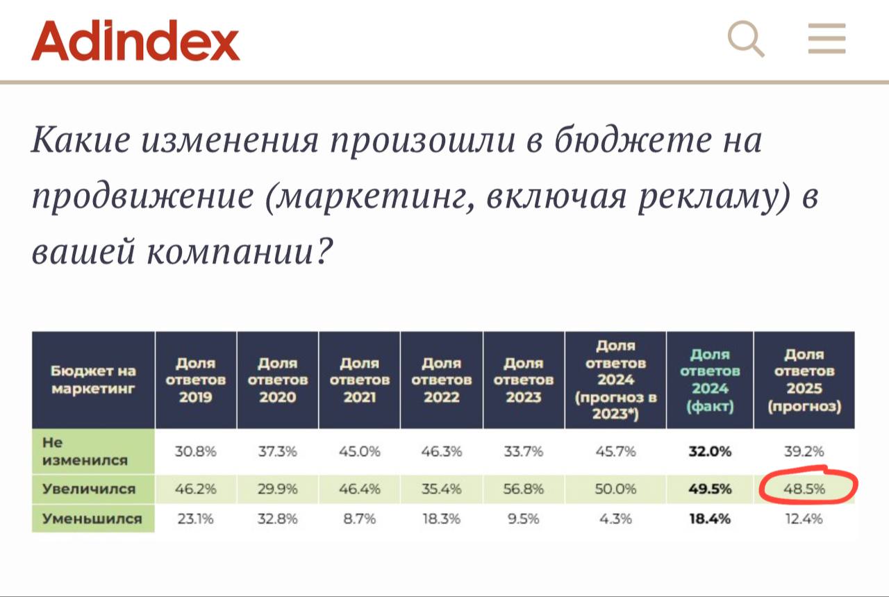 😂 Похоже, около 50% респондентов среди маркетологов застройщиков подвирают Адиндексу, что их бюджеты на рекламу вырастут в 2025 году…