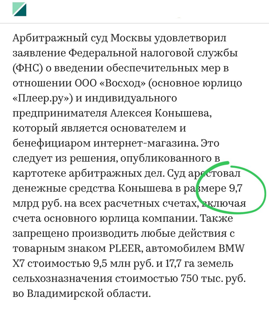 🤔 А вот арест активов плеер ру и его владельца по иску ФНС относительно неуплаты налогов на 10 миллиардов рублей…