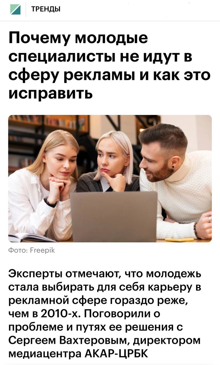 Тем не менее, современная молодежь — не дурак. И вот уже рекламная индустрия вопит о недостатке молодых кадров со страниц деловых СМИ. Мол, непопулярны мы и непрестижны. Сами виноваты.