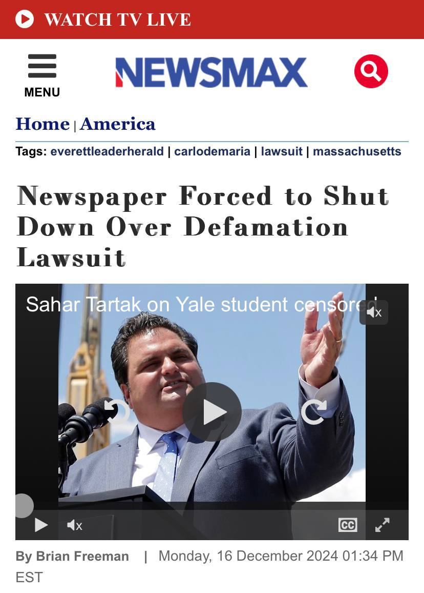 Газета Everett Leader Herald, издающаяся в Массачусетсе на протяжении 139 лет, прекратит своё существование в течение недели и выплатит 1,1 миллиона долларов в рамках урегулирования иска о клевете, поданного мэром Эверетта Карло ДеМарией.