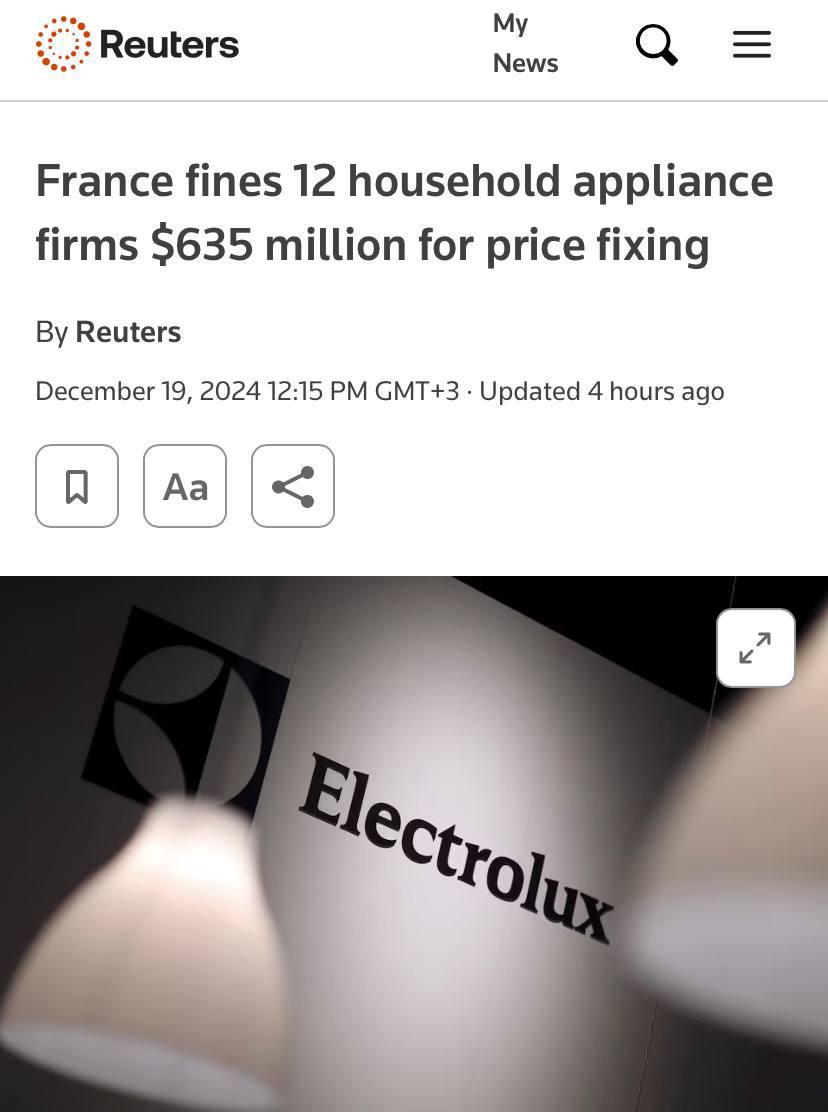 Французское антимонопольное агентство оштрафовало 12 производителей и дистрибьюторов бытовой техники, включая Electrolux, Whirlpool и LG в общей сложности 611 000 000 евро из-за ценового сговора в период с 2007 по 2014 год.