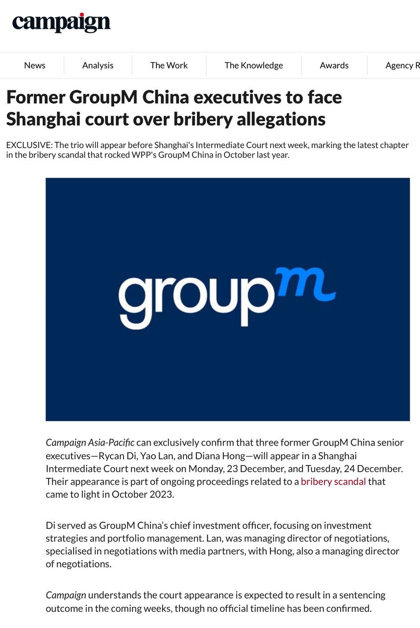 Три бывших топ-менеджера GroupM China — Райкан Ди, Яо Лань и Диана Хонг — предстанут перед Шанхайским судом на следующей неделе, в понедельник, 23 декабря, и во вторник, 24 декабря. Это связано с продолжающимся расследованием скандала со взяточничеством, который разразился в октябре 2023 года.