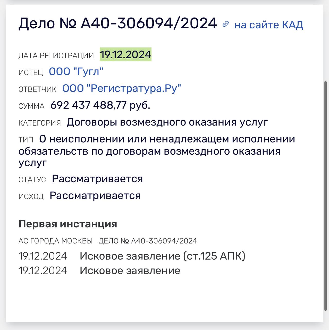 🤔 Внезапно Гугль выкатил запоздалый на год иск на 700 миллионов к ООО «Регистратура.ру», которое Айконтекст, которые сами знаете кто…