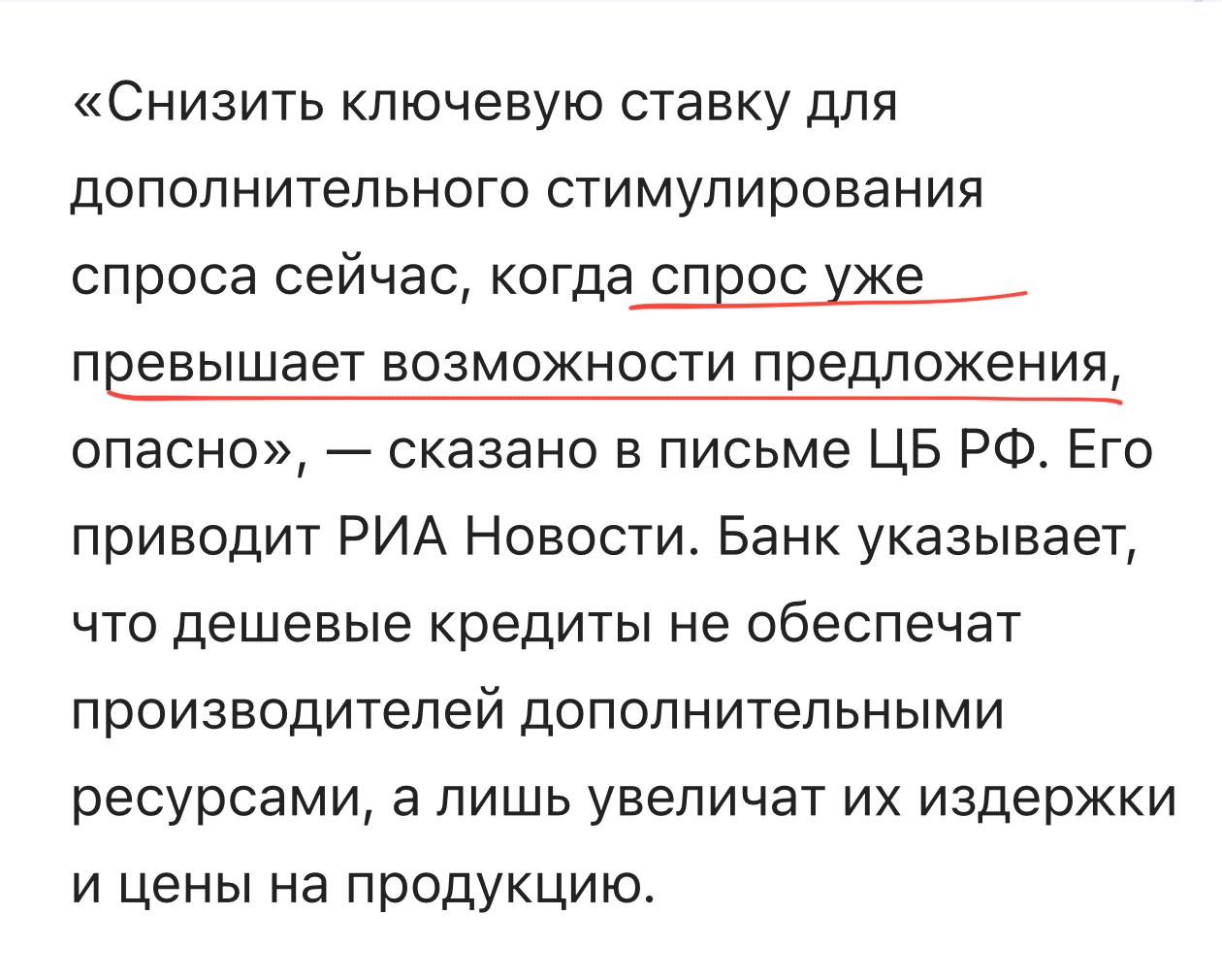 🤓 В своем обосновании удержания ставки ЦБ фиксирует любопытный факт — «спрос [потребительский, в том числе] уже превышает возможности предложения».