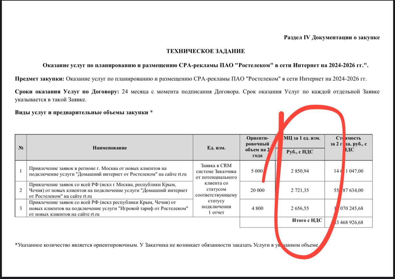 🤔 Цены привлеченного лида и обьемы в перформанс-тендере Ростелекома.