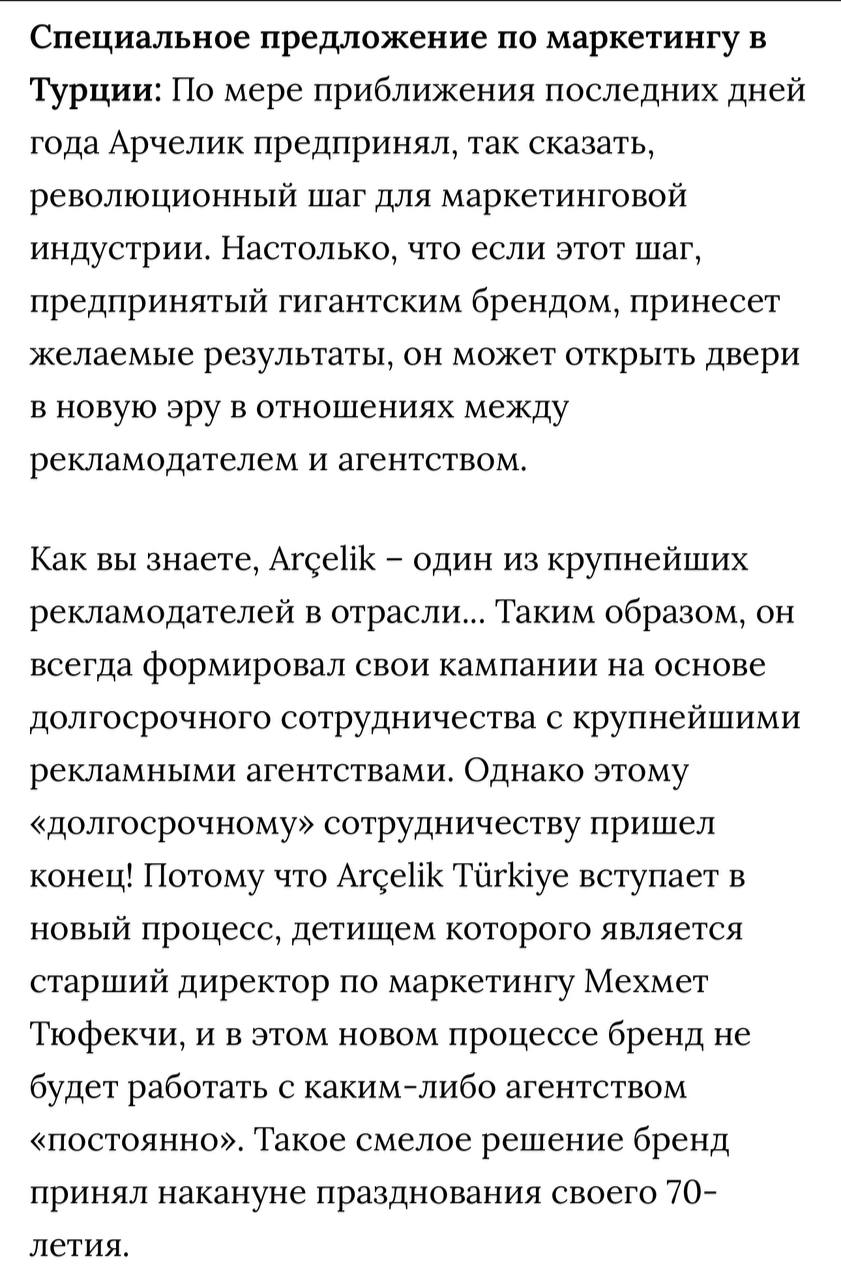 «Революционный шаг в рекламной индустрии: у Arçelik больше нет и никогда не будет агентства!«, — пишет местное индустриальное СМИ. Вместо этого он будет локально тендерить каждый проект среди пула выбранных игроков (4 штуки).