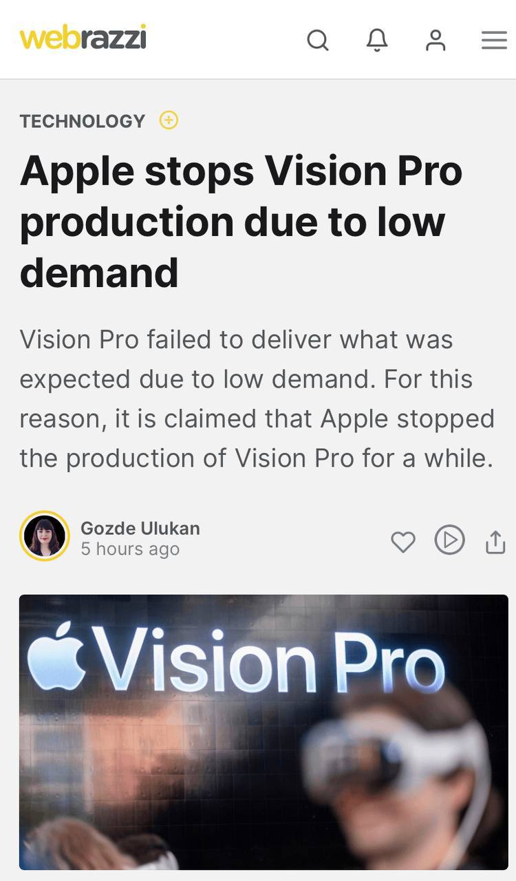 😵 Apple решила прекратить производство Vision Pro из-за низкого спроса на продукт.