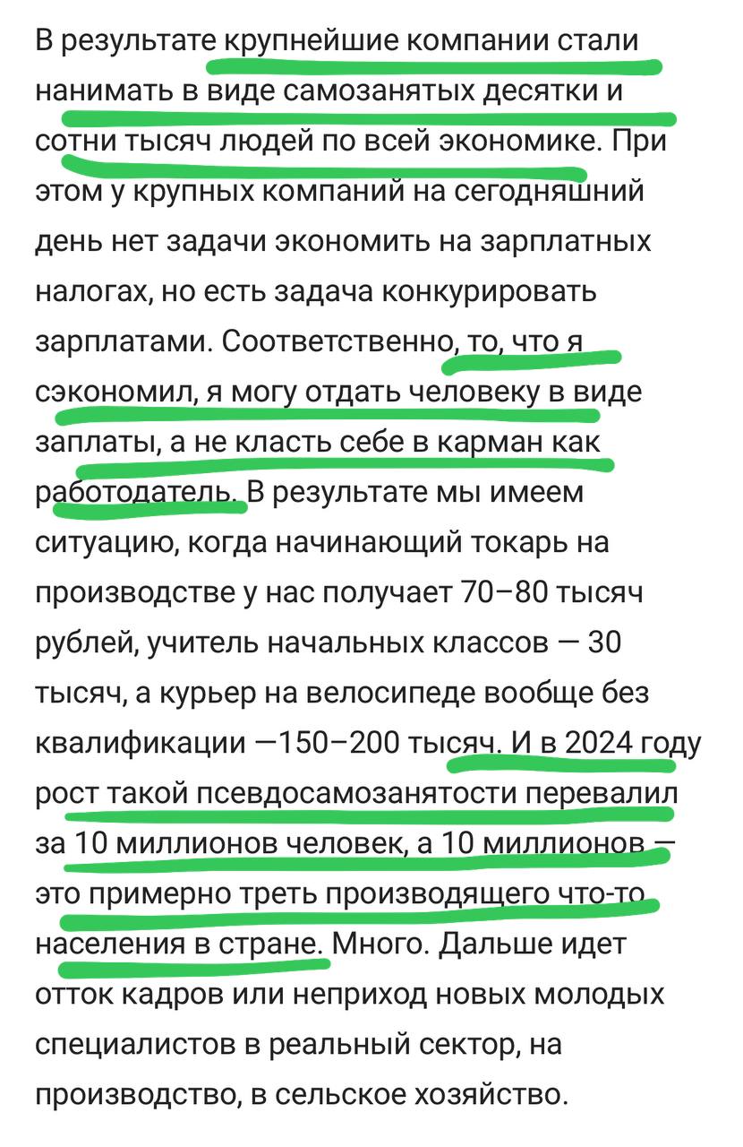 🤓 Очень хороший длинный текст о том почему самозанятость размыла все показатели зарплат в потребительской экономике. Почему рынок доставки — экстремальный пузырь, который скоро рухнет за счет неизбежных регуляторных воздействий государства. И вообще — куда мы все вместе катимся на этих чудесных электровелосипедиках.