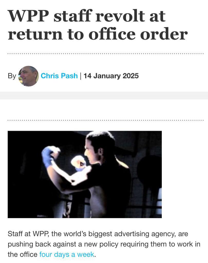 Сотрудники WPP взбунтовались. Персонал крупнейшего в мире рекламного агентства, выступают против новой политики, которая требует от них работать в офисе четыре дня в неделю.