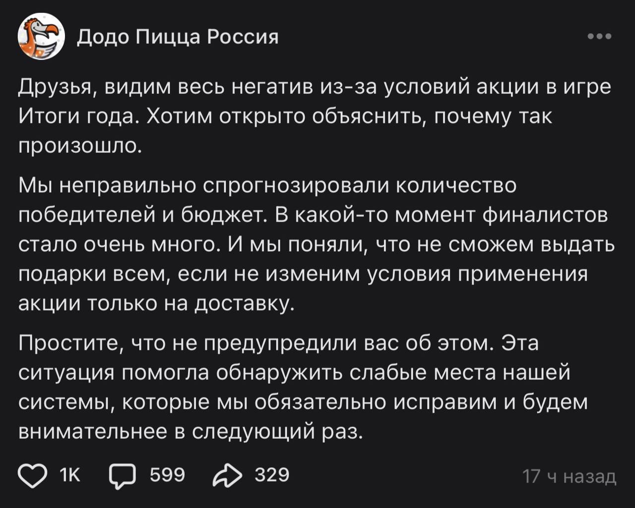 🤓 Господа из Додо Пиццы эпически обделались, поменяв на ходу условия акции, и оставив массу народа без гарантированных призов