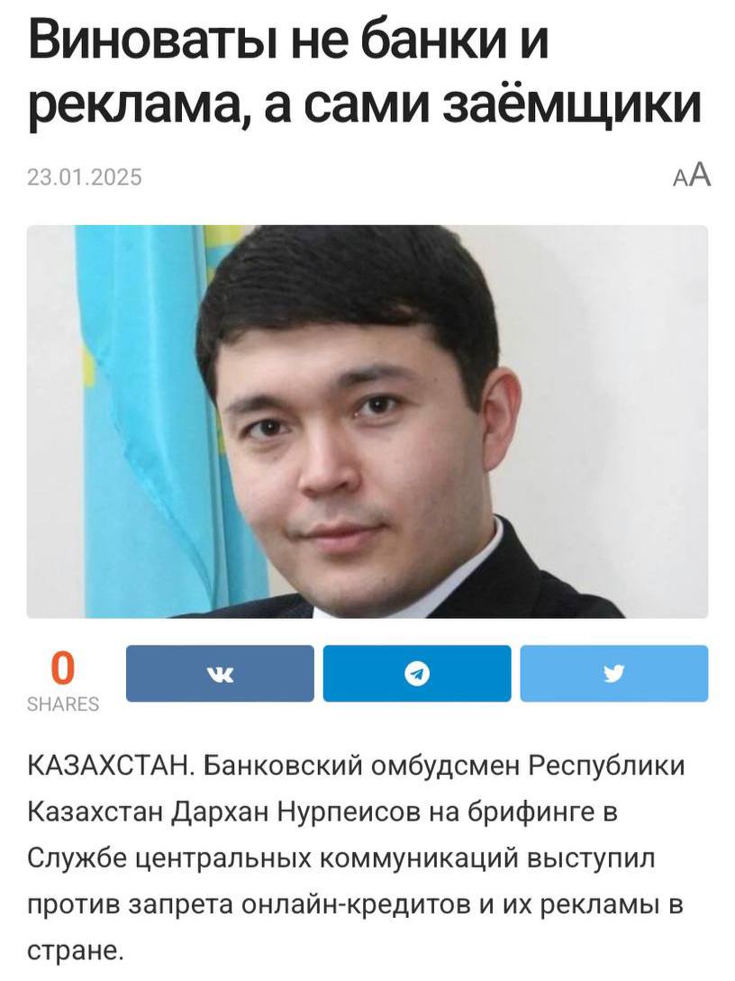 🤓 В Казахстане омбудсмен Дархан Нурпеисов обвинил самих заемщиков в их закредитованности, выступая против запрета рекламы онлайн кредитов.