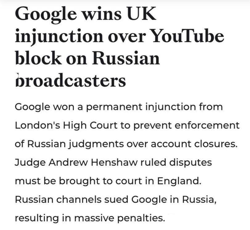🤓 Компания Google добилась в Высоком суде Лондона вынесения постоянного судебного запрета, который не позволит приводить в исполнение решения российских судов по делу о закрытии аккаунтов российского ТВ на Ютьюб.