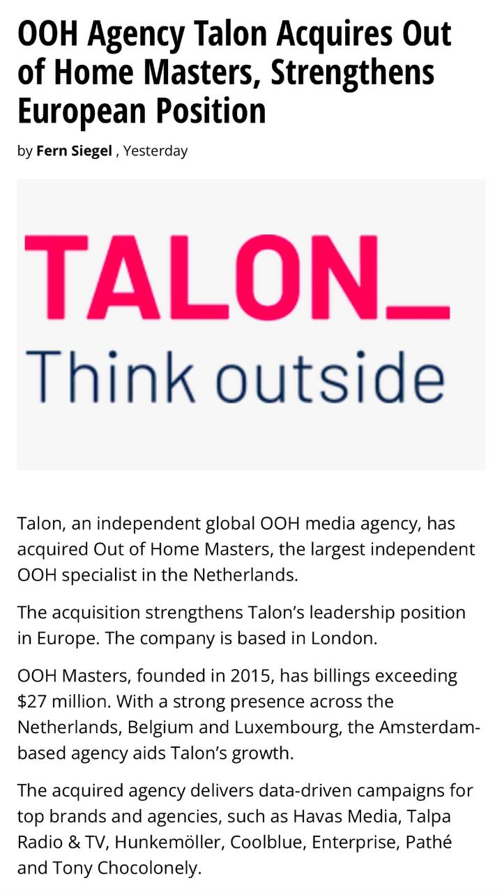ΠΠ΅Π·Π°Π²ΠΈΡΠΈΠΌΠΎΠ΅ Π³Π»ΠΎΠ±Π°Π»ΡΠ½ΠΎΠ΅ ΠΌΠ΅Π΄ΠΈΠ°Π°Π³Π΅Π½ΡΡΡΠ²ΠΎ Talon, ΡΠΏΠ΅ΡΠΈΠ°Π»ΠΈΠ·ΠΈΡΡΡΡΠ΅Π΅ΡΡ Π½Π° OOH-ΡΡΠ½ΠΊΠ΅ ΠΏΡΠΈΠΎΠ±ΡΠ΅Π»ΠΎ Out of Home Masters, ΠΊΡΡΠΏΠ½Π΅ΠΉΡΠ΅Π³ΠΎ Π½Π΅Π·Π°Π²ΠΈΡΠΈΠΌΠΎΠ³ΠΎ ΠΈΠ³ΡΠΎΠΊΠ° Π² Π½Π°ΡΡΠΆΠΊΠ΅ ΠΠΈΠ΄Π΅ΡΠ»Π°Π½Π΄ΠΎΠ².