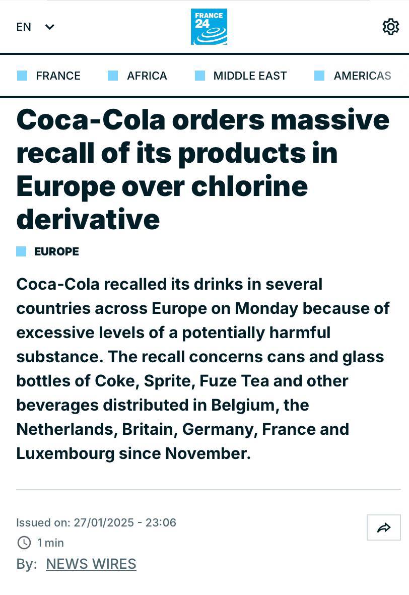 🤓 Coca-Cola отзывает большое количество своей продукции в Европе из-за высокого содержания хлора.