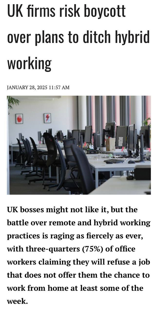 🤓 Похоже, европейские работодатели в западне. Британские фирмы рискуют быть бойкотированными из-за планов отказаться от гибридной работы. Три четверти (75%) офисных работников уволятся с работы, если им не дадут возможность работать из дома хотя бы часть недели.