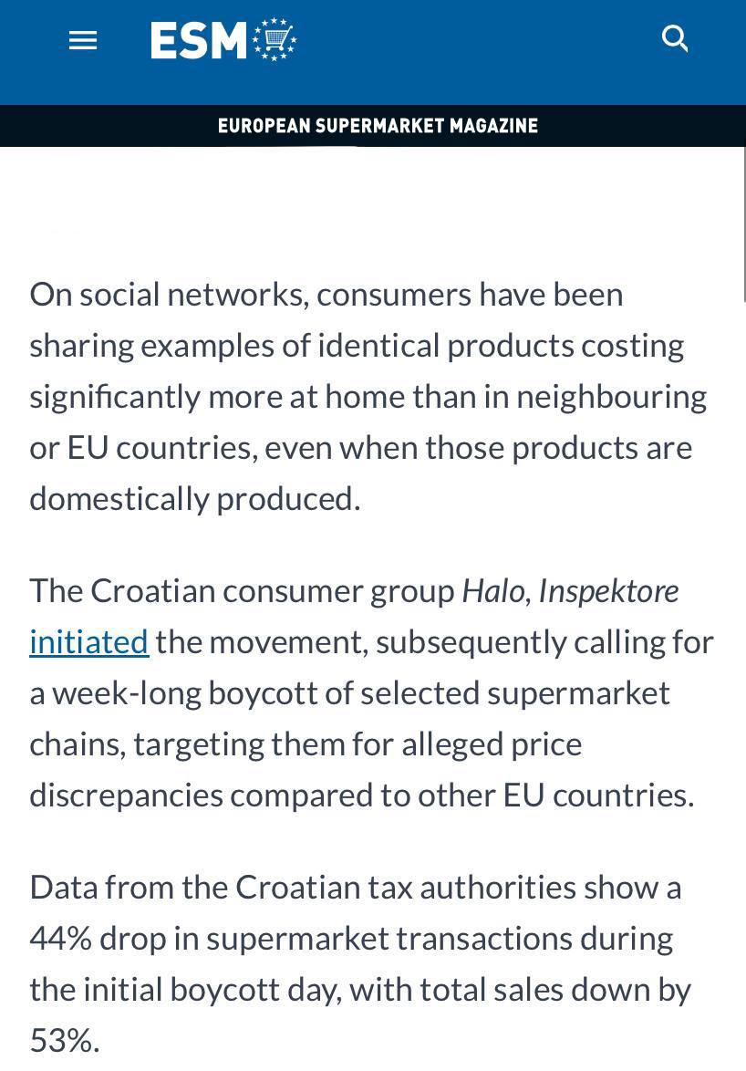 Данные налоговых органов Хорватии показывают падение транзакций в супермаркетах на 44% в течение первого дня бойкота, при этом общий объем продаж снизился на 53%.