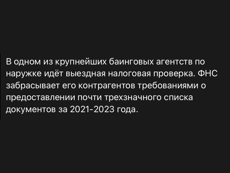 🤓В каком из крупнейших баинговых агентств на этой неделе налоговая изымает документы за схемы с НДС? Чьих партнеров трясут?