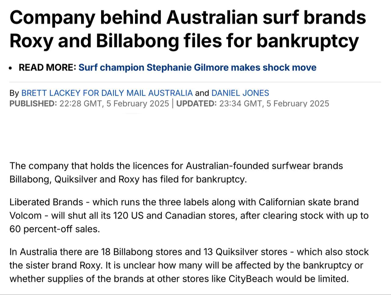 🤓Уходит эпоха. Владелец австралийских серф-брендов Roxy и Billabong, подает заявление о банкротстве.