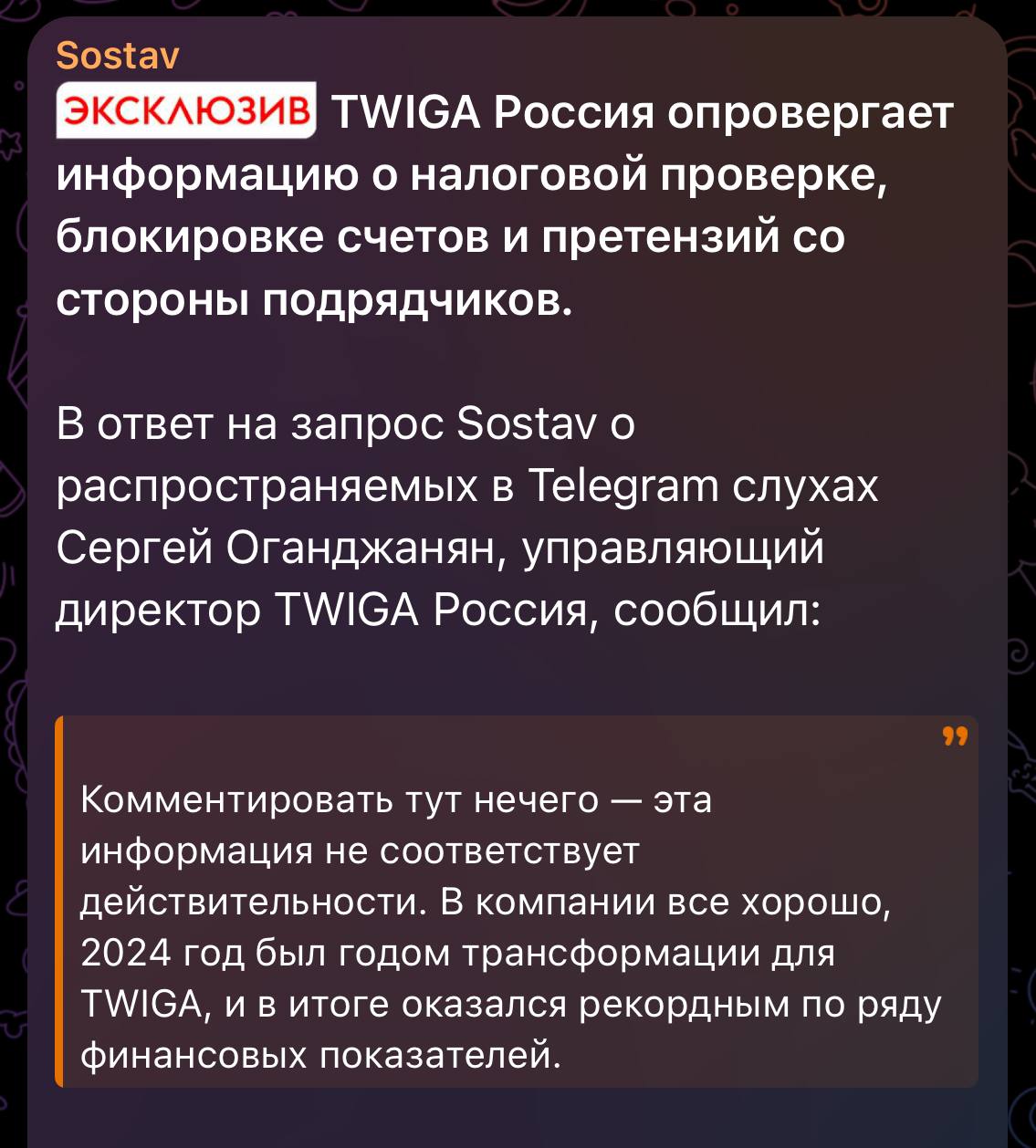 Немедленно Twiga дает опровержение через Состав.