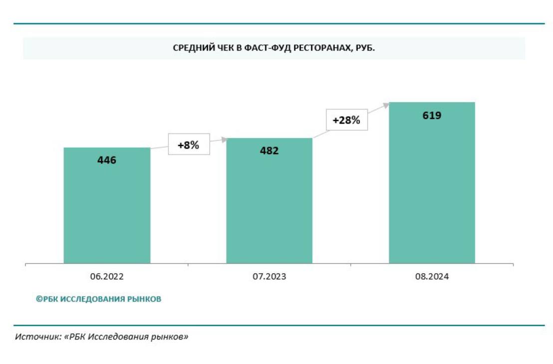 Рост среднего чека в 2024 году оказался самым высоким как минимум с 2012 года.По темпам роста среднего чека в последние годы фаст-фуд опередил многие другие сегменты рынка общественного питания. В частности, это привело к сокращению разницы между расходами россиян в фаст-фуде и ресторанах среднего ценового сегмента с обслуживанием: в июне 2022 года средний чек в заведениях быстрого питания был на 71% ниже, чем в ресторанах, а в июле 2024 года разница сократилась до 66%.