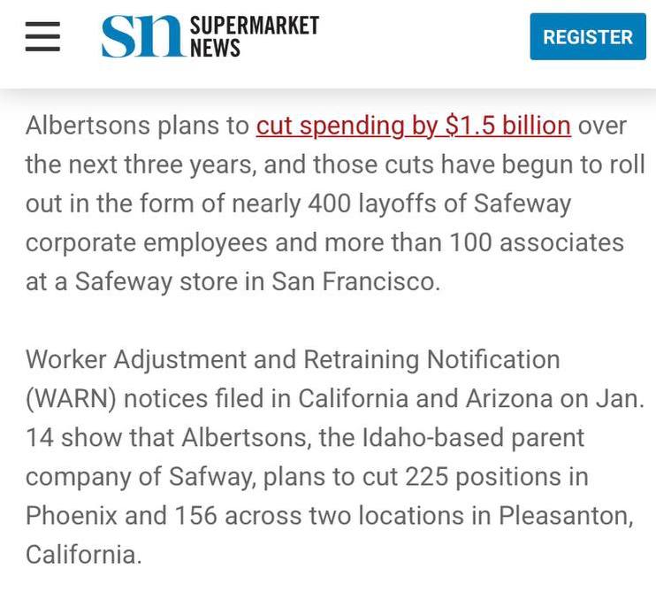 Π‘ΠΎΠΊΡΠ°ΡΠ΅Π½ΠΈΡ ΡΠΆΠ΅ Π½Π°ΡΠ°Π»ΠΈΡΡ Ρ ΡΠ²ΠΎΠ»ΡΠ½Π΅Π½ΠΈΡ ΠΏΠΎΡΡΠΈ 400 ΠΊΠΎΡΠΏΠΎΡΠ°ΡΠΈΠ²Π½ΡΡ ΡΠΎΡΡΡΠ΄Π½ΠΈΠΊΠΎΠ² Safeway ΠΈ Π±ΠΎΠ»Π΅Π΅ 100 ΠΏΡΠΎΠ΄Π°Π²ΡΠΎΠ² Π² ΠΌΠ°Π³Π°Π·ΠΈΠ½Π΅ Safeway Π² Π‘Π°Π½-Π€ΡΠ°Π½ΡΠΈΡΠΊΠΎ.