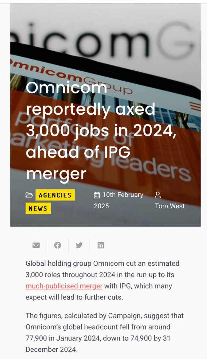 🤔Глобальный Omnicom сократила около 3000 должностей в 2024 году в преддверии своего широко разрекламированного слияния с IPG, которое, как многие ожидают, приведёт к дальнейшему сокращению штата.