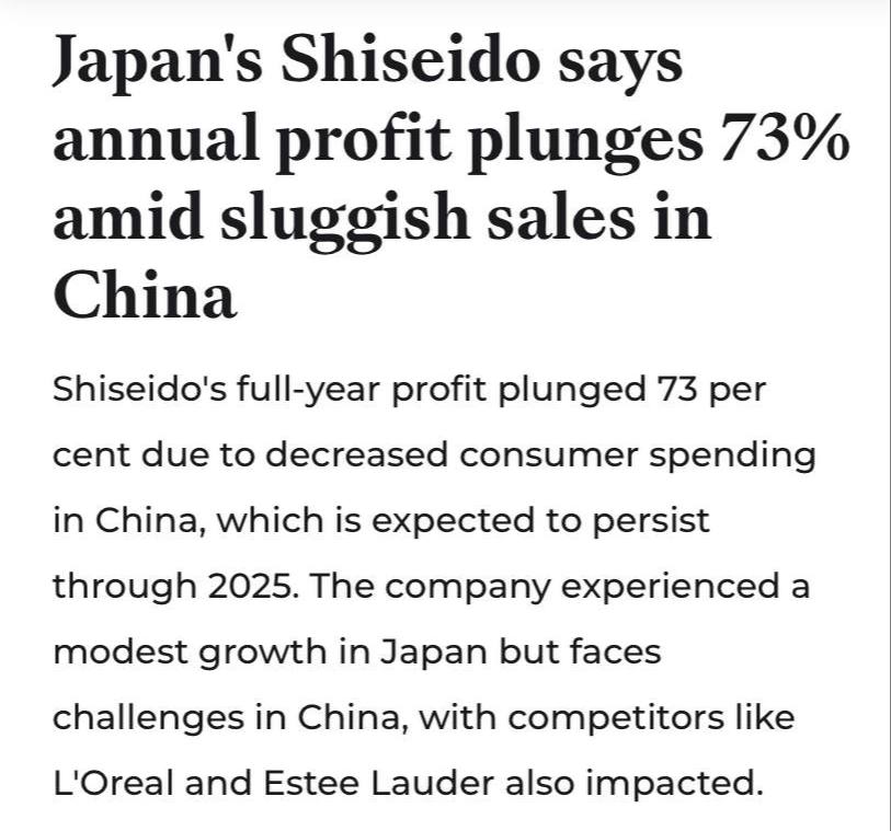 Π―ΠΏΠΎΠ½ΡΠΊΠΈΠΉ ΠΊΠΎΡΠΌΠ΅ΡΠΈΡΠ΅ΡΠΊΠΈΠΉ Π³ΠΈΠ³Π°Π½Ρ Shiseido (ΠΎΠ΄Π½Π° ΠΈΠ· ΠΏΠ΅ΡΠ²ΡΡ ΠΊΠΎΡΠΌΠ΅ΡΠΈΡΠ΅ΡΠΊΠΈΠΉ ΠΊΠΎΠΌΠΏΠ°Π½ΠΈΠΉ Π² ΠΌΠΈΡΠ΅, Π±ΡΠ»Π° ΠΎΡΠ½ΠΎΠ²Π°Π½Π° Π² 1872 Π³ΠΎΠ΄Ρ) Π·Π°ΡΠ²ΠΈΠ», ΡΡΠΎ Π΅Π³ΠΎ ΠΏΡΠΈΠ±ΡΠ»Ρ Π·Π° Π³ΠΎΠ΄ ΡΠΎΠΊΡΠ°ΡΠΈΠ»Π°ΡΡ Π½Π° 73%, ΠΎΡΡΠ°ΡΡΠΈ ΠΈΠ·-Π·Π° ΡΠ½ΠΈΠΆΠ΅Π½ΠΈΡ ΠΏΠΎΡΡΠ΅Π±ΠΈΡΠ΅Π»ΡΡΠΊΠΈΡ ΡΠ°ΡΡ ΠΎΠ΄ΠΎΠ² Π½Π° ΠΊΠ»ΡΡΠ΅Π²ΠΎΠΌ Π·Π°ΡΡΠ±Π΅ΠΆΠ½ΠΎΠΌ ΡΡΠ½ΠΊΠ΅ — Π² ΠΠΈΡΠ°Π΅.