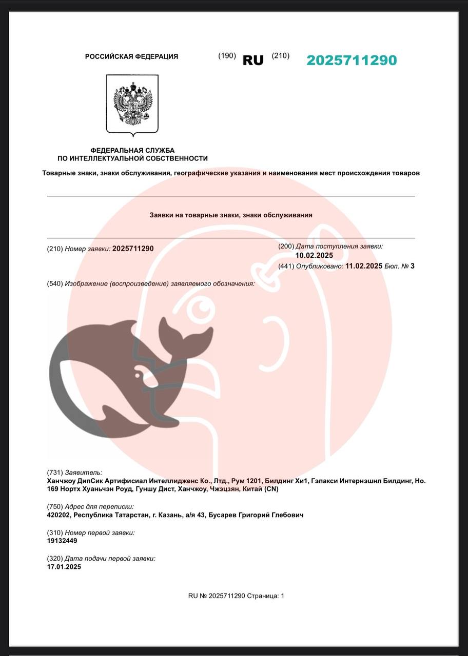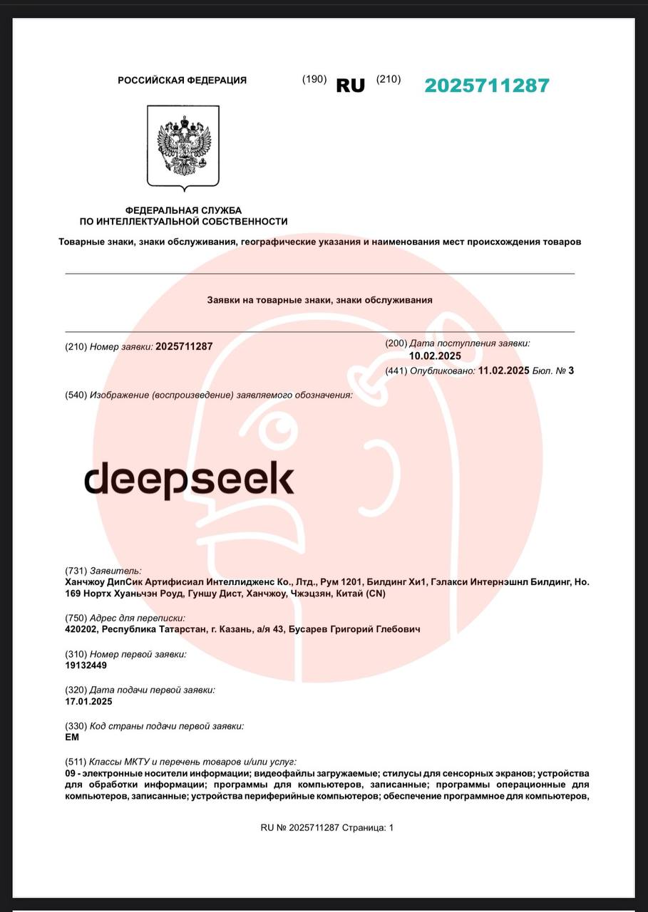 🤔Deepseek официально пришел в Россию. Кажется, это настоящий китайский правообладатель регистрирует свой товарный знак в Роспатенте
