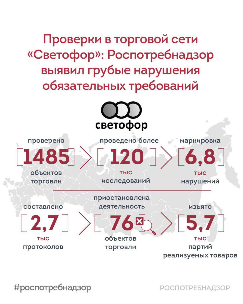 Как вам масштаб мероприятий? Территориальными органами Роспотребнадзорапроведены контрольные (надзорные) мероприятия в отношении 1 485 объектов, осуществляющих деятельность под торговой маркой «Светофор».