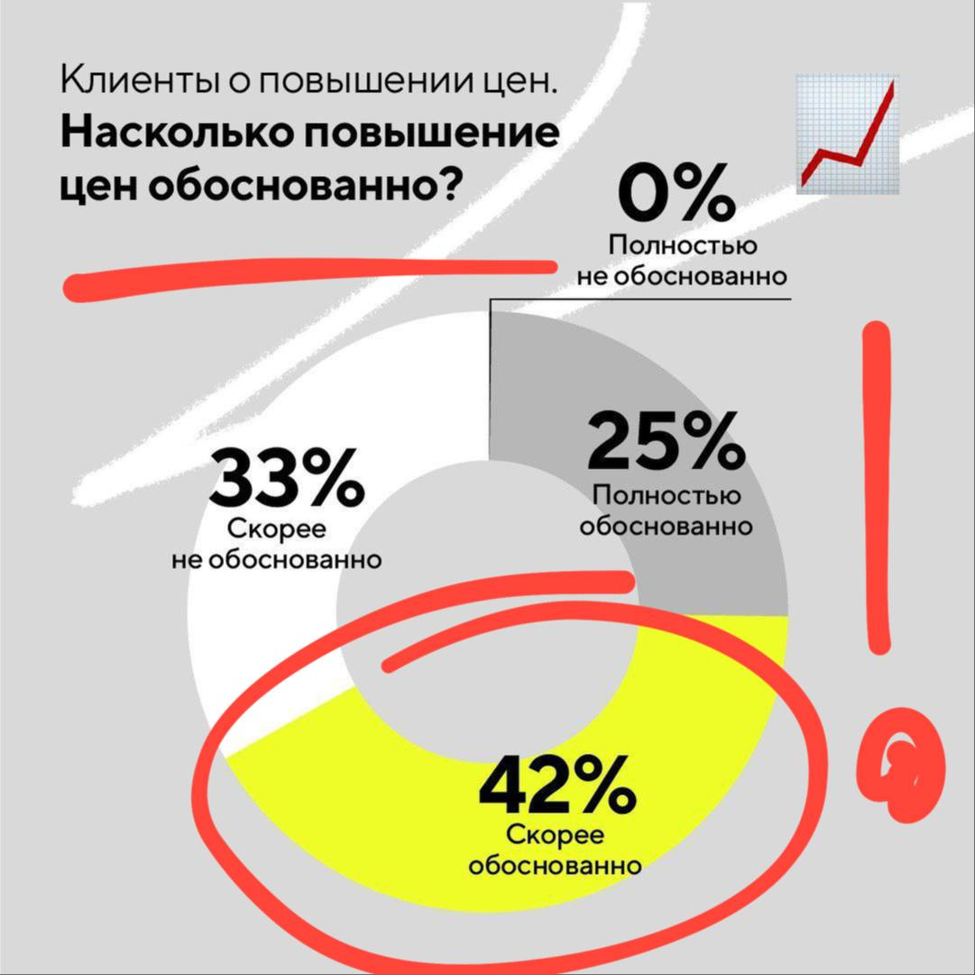 Обратите внимание на выделенный слайд — там 67% клиентов считает повышение обоснованным. Не «какого хрена!?» — а участливое понимание «ну, надо, так надо»…