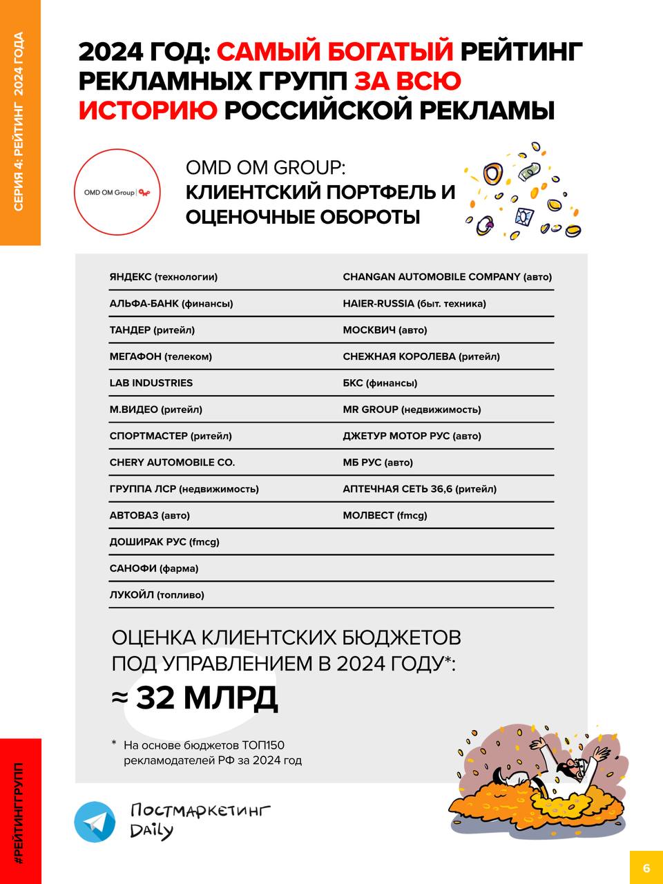 🤓Продолжаем публикацию Полного Рейтинга рекламных групп и агентств за 2024 год от Постмаркетинг Daily. Как вы помните это — Самый богатый Рейтинг за всю историю российской рекламы.
