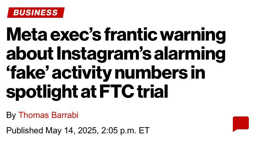 🤓Важный звоночек. Вчитайтесь. Внутренние документы Meta (экстремистской и запрещенной), опубликованные в ходе судебного разбирательства Федеральной торговой комиссии (FTC), обнажили тревожные данные о том, что до 40%‼️ активности в Instagram (тоже экстремисты и извращенцы) могли быть сфальсифицированы.