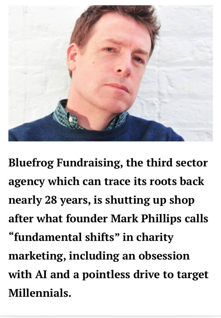 Британское агентство Bluefrog Fundraising, которое помогает благотворительным организациям улучшать стратегии сбора средств, и работавшее почти 28 лет, закрывается по решению основателя Марка Филлипса.